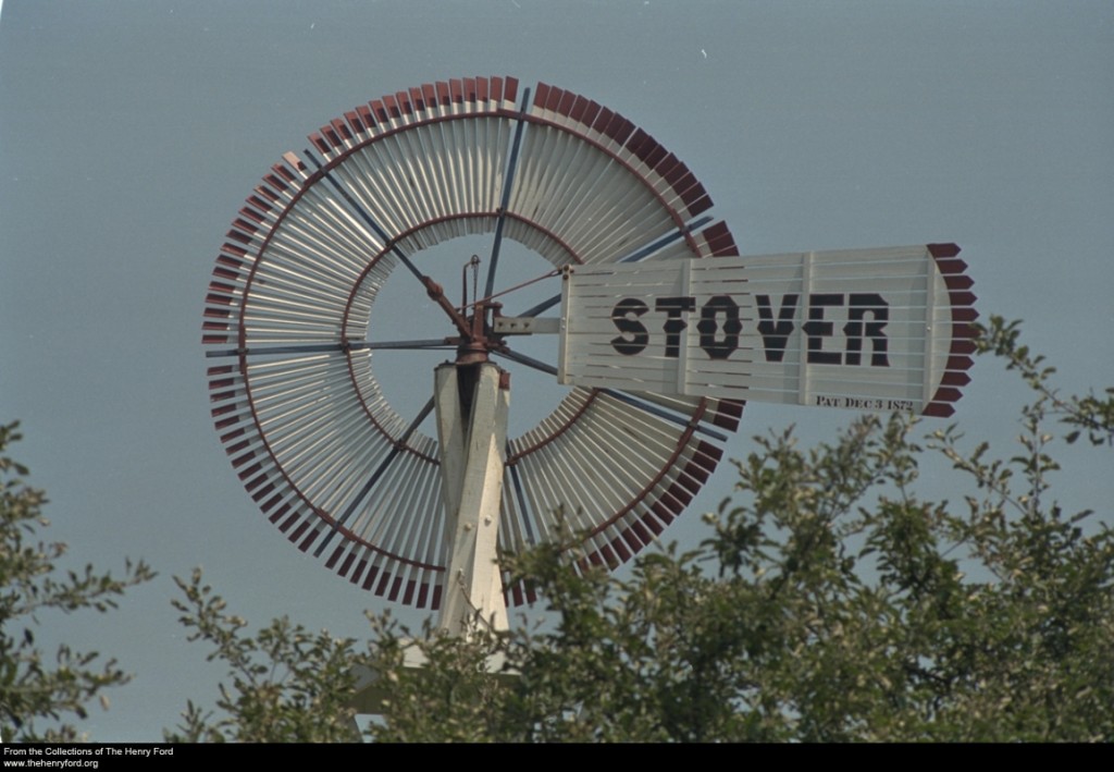 When Henry Ford restored his boyhood farm in 1919, he believed it important to locate a Stover Windmill and resurrect it. In 1944, Henry moved the home to Greenfield Village, and the Stover made the trip, too. Sometime after his death the windmill was removed from the homestead. Edward Cutler, Henry Ford's architect for Greenfield Village, commented that he heard it was Clara Ford's idea because she did not like "looking at the thing," but "it sounds rather weak that she would object to looking up at the windmill." No one really knows why the windmill came down.