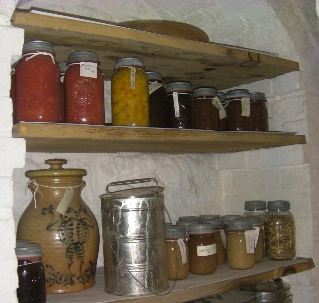 Near the meat are several other foods that were preserved last year, including dried chili peppers, pickles and crocks of sauerkraut as well as jars of tomatoes, pickled green beans, applesauce and more.
