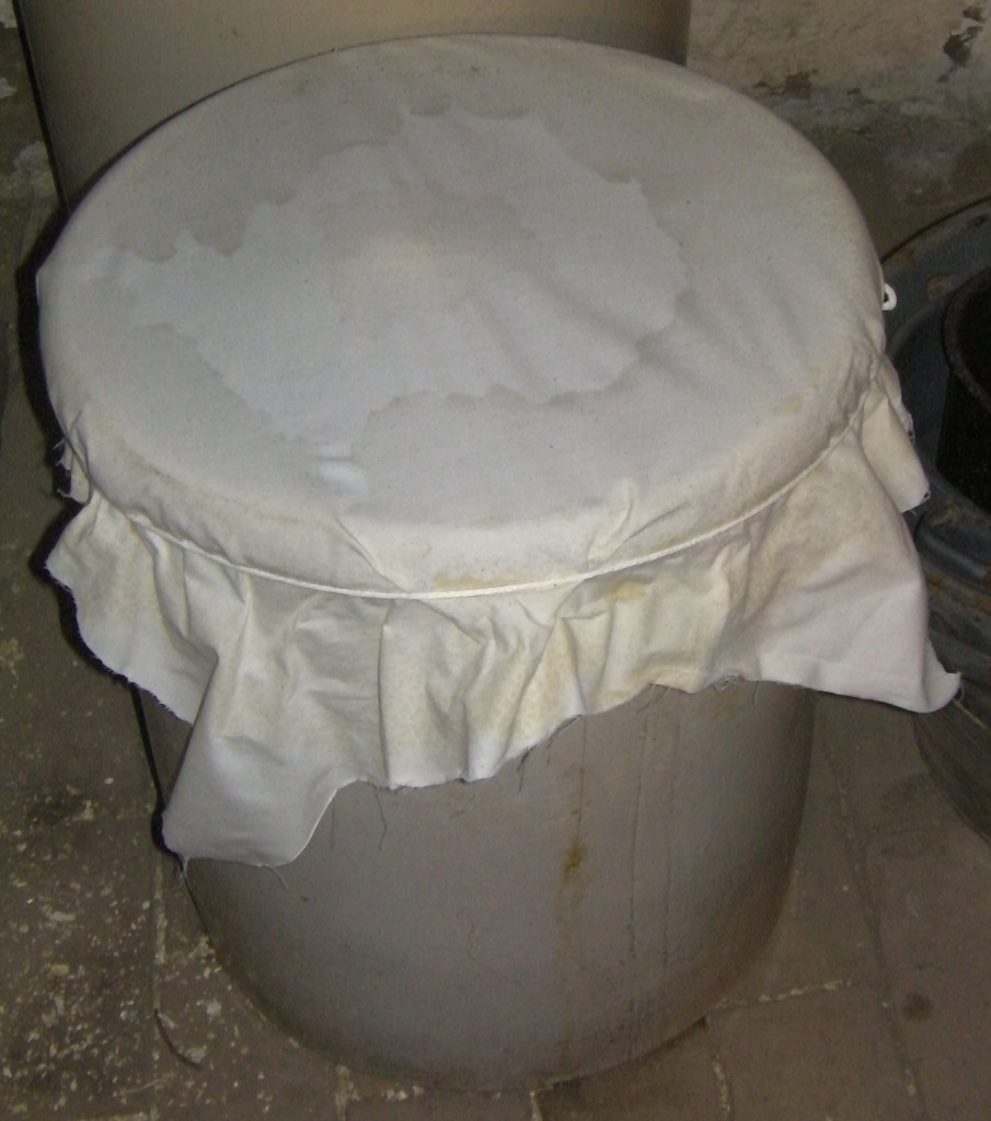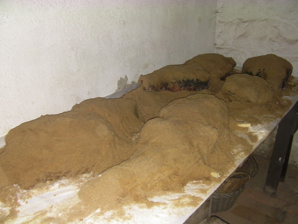Once the meat is cured, it is wrapped in cheesecloth sacks and hung in the cold room located in Firestone Farm’s cellar.